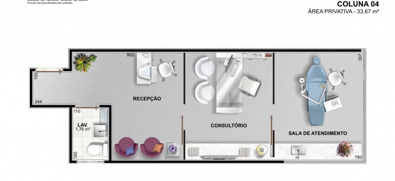 Composto por 62 salas comerciais de 27,50 a 35,84m² de área privativa, todas com banheiro e previsão para ar-condicionado do tipo split; divididas em 13 andares, destinadas a diversas atividades.